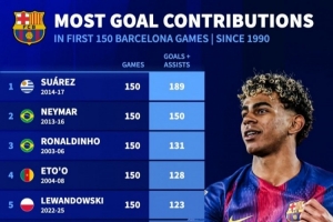 体育资讯4月15日讯 巴萨在本轮欧冠客场2-1击败马竞、总比分2-3出局。亚马尔在本场比赛迎来个人欧冠生涯150场并取得进球,也跻身巴萨队史同期直接参与进球榜前十。